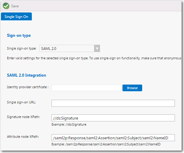 From the Single sign-on type list, select SAML 2.0. The SAML 2.0 settings are listed.