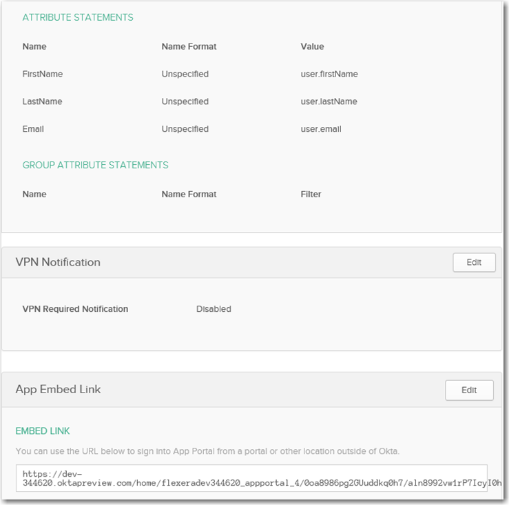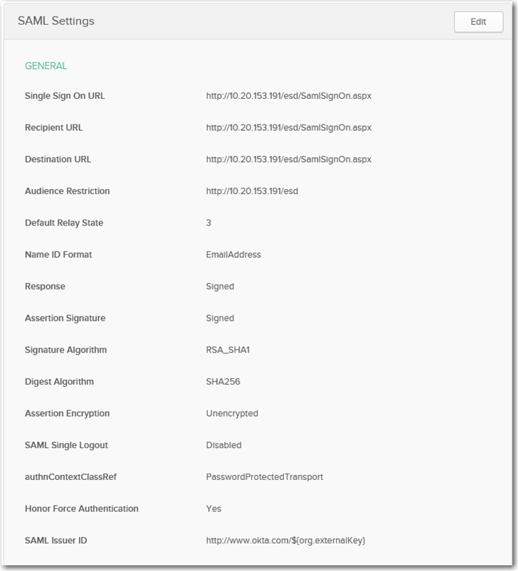 http://YOURAPPPORTALSERVER/esd/SamlSignOn.aspxnoteThis URL would be entered in the Single Sign On URL, Recipient URL, and Destination URL fields in the Okta sample settings, shown above.