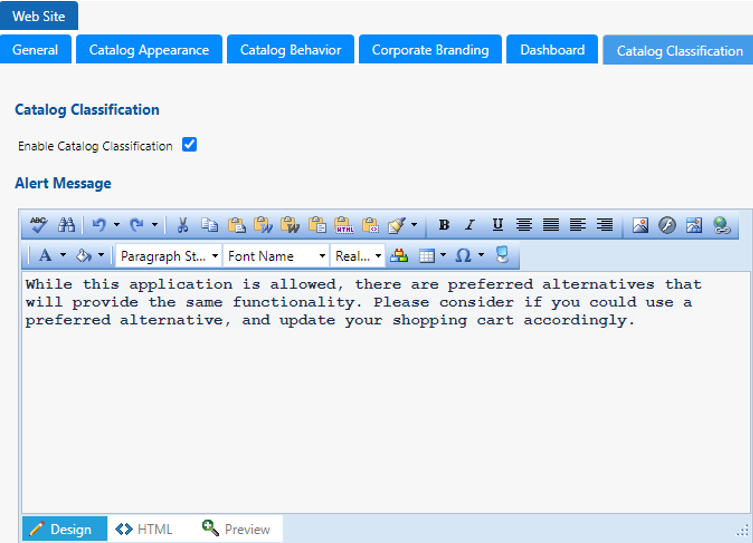 | Alert Message | Enter the alert message to be displayed when user selects a non-preferred catalog for checkout. Note: The alert message in the image is added as an example. The alert message is empty out of the box. |