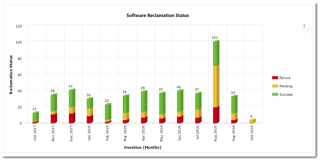 Each bar represents the total number of successfully reclaimed software for that time slot, with the total number displayed on the top of each bar. Each bar is divided by colors with each color representing individual software titles. When hovering over a color, the name of the software title is displayed along with the version and the reclaimed count for that duration.