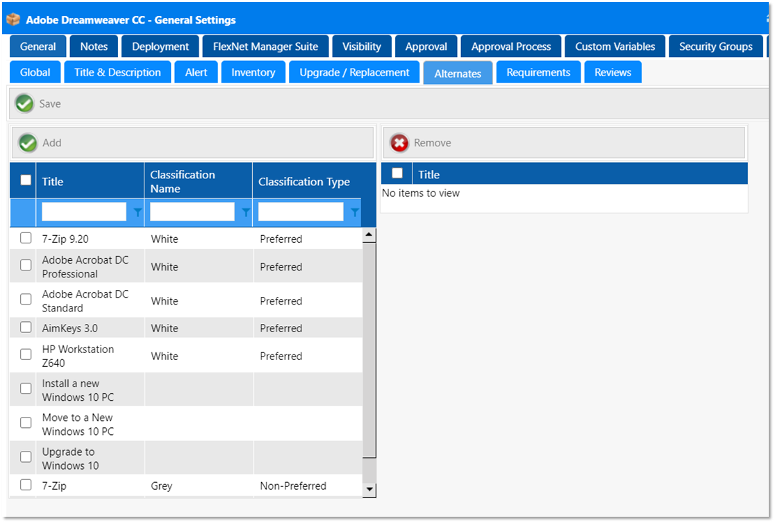 When Global Checkbox for Classification is enabled, a catalog item along with its classification name and classification type are displayed in the left panel. Preferred catalog items are displayed on the top.