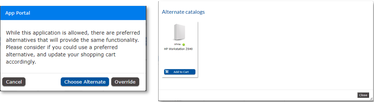 These alternates are displayed on click of Choose Alternate button in the alert message when end user tried to checkout a catalog of type Non-Preferred. The image shows an example of alert message and the alternates views when a user selects Choose Alternates.