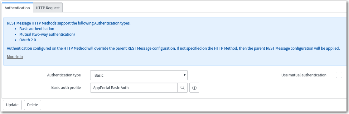 On the Authentication tab, set Authentication type as desired for your organization. By default, None will be selected. Select the authentication type that the selected ServiceNow MID server should use to access the App Portal REST API.
