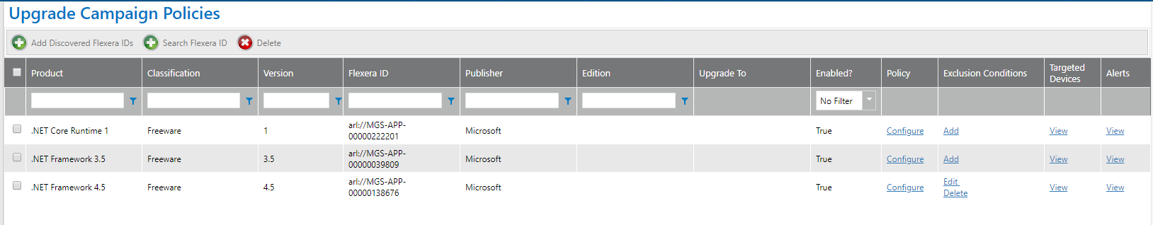 Search Flexera IDsClick to create a campaign to upgrade an application that could be installed in your enterprise in the future. The Search for Flexera ID view opens, listing all of the existing applications/versions in the FlexNet Manager Suite database.