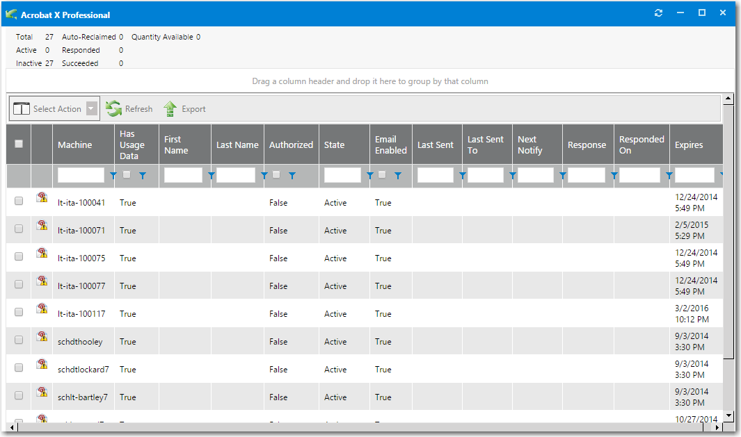 Item Description The first column allows the selection of the row for an action. The email alert icon denotes that the machine identified for reclamation does not have an associated user and will be unable to send email notifying of the action. User Columns Identifies properties of the user and computer Authorized Authorized indicates whether the record is authorized to begin sending email notifications. When the license reclamation settings indicate that approval should be given before reclaiming, all records are added as unauthorized. State State indicates one of two possible states of a record: - Active —The request is actively pursuing reclamation against the target.