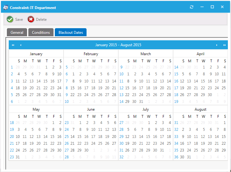 Open the Blackout Dates tab. Use blackout dates to limit scheduling options such as holidays. The requester will not be able to select a date from the scheduler if it is blacked out.