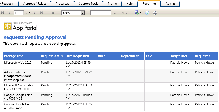 On the Reporting tab, you can view App Portal data in a read-only, searchable, and exportable view. Over 40 reports are included with App Portal. You can view existing reports, create and edit report categories, and even create your own custom reports.