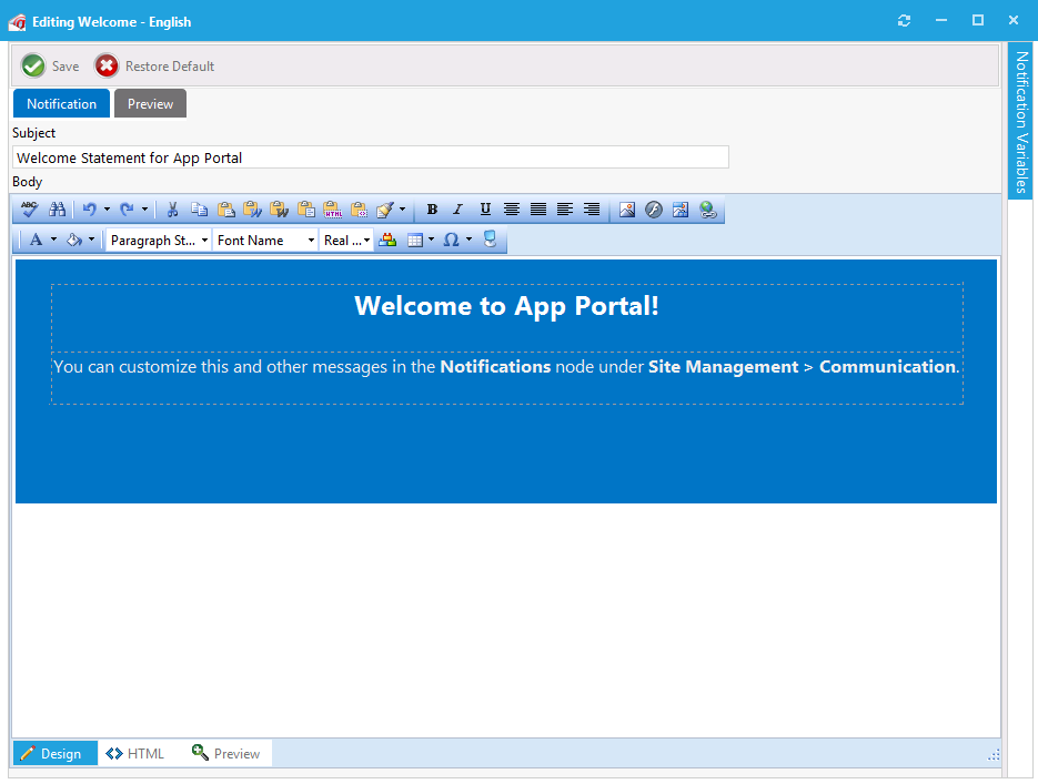 Under Site Management, select Communication > Notifications. The Notifications View opens.